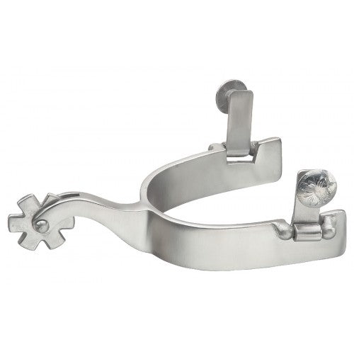 Brushed sainless steel trainer spur with oval cup. 1" band wih 2 1/8" curved shank and 1" - 6 point blunt rowel. Moderate effect. Men's.