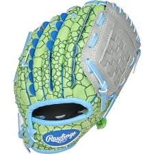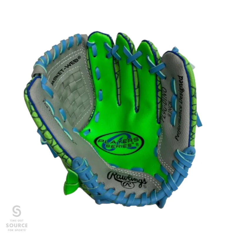 Rawlings Dino baseball fielding glove gives young players the comfort and performance they crave, thanks to its soft split synthetic leather and basket web construction. The fun scaled pattern offers a unique look on the baseball diamond while the regular fit and 9-inch size deliver a comfortable and functional glove for practice or games.